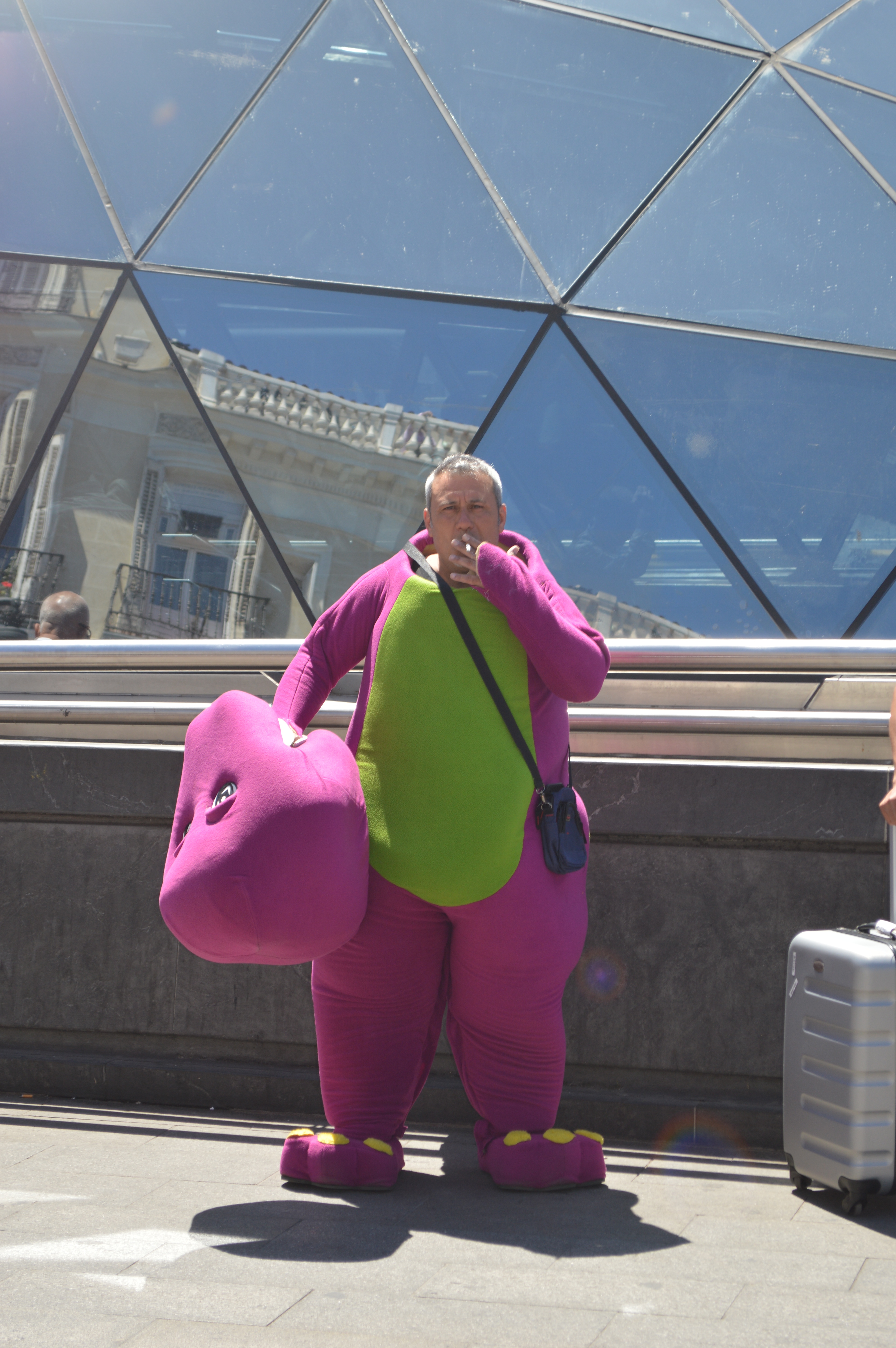 DSC_0042Truthfully, I rather detest Barney as a character. However, I couldn’t resist the irony of Barney smoking. If I had been ready with my camera just five seconds earlier, the picture would have showed Barney smoking with his head still on. It was a strange juxtaposition; a childhood icon engaging in destructive behavior.