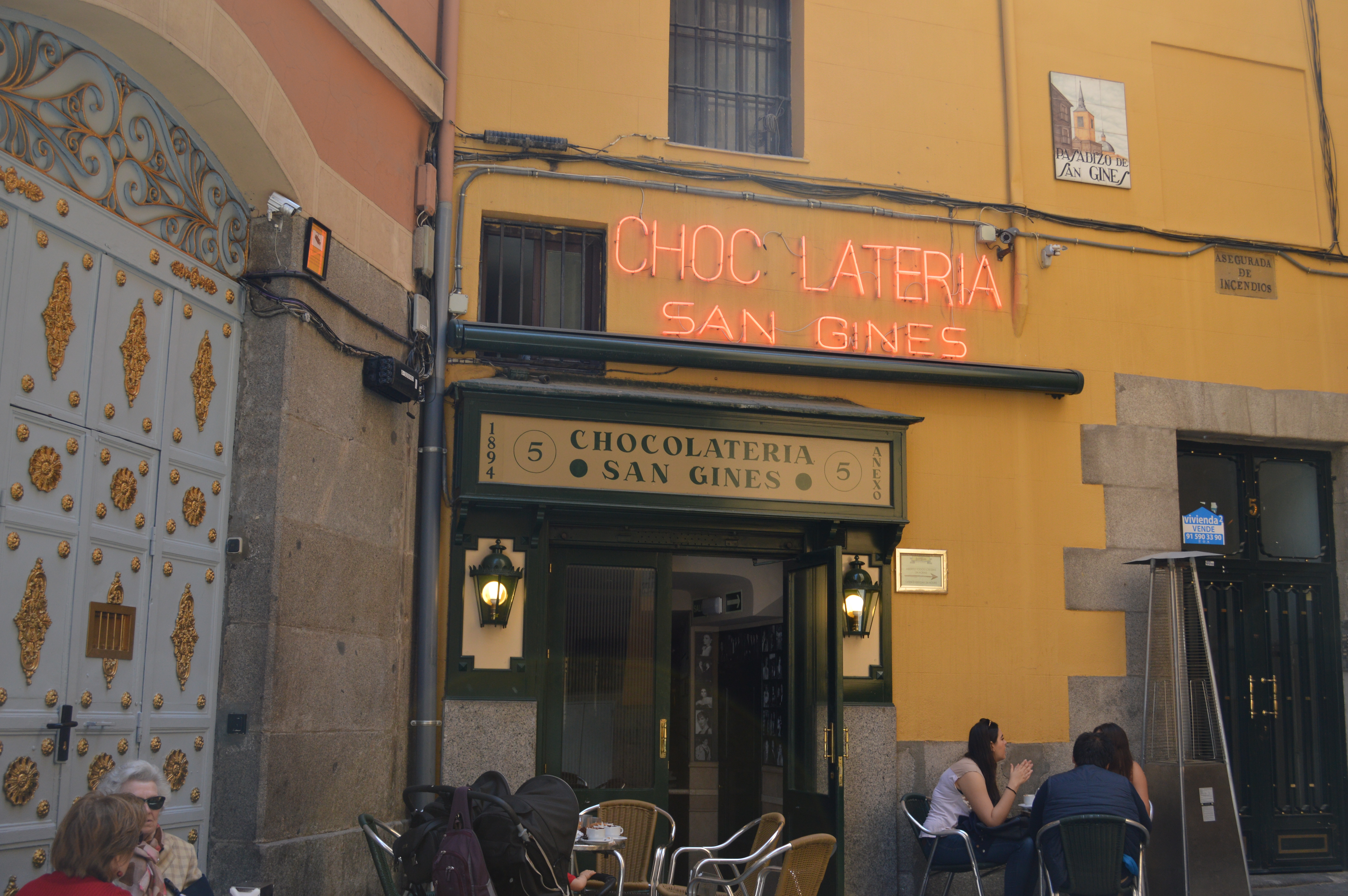 My husband looked forward to the experience of eating churros con chocolate with me and his children for a long time before we traveled to Spain. Here, on our first day in Madrid, he found a delicious chocolateria close to Plaza Mayor for us to enjoy this quintessential Spanish dessert. The chocolate cake was delicious. The churros were wonderful. The setting was magical.